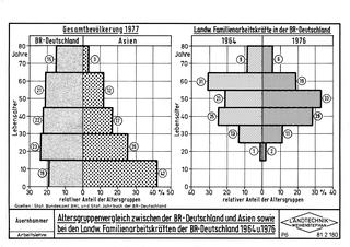 Altersgruppenvergleich zwischen der BR Deutschland und Asien sowie bei den landwirtschaftlichen Familienarbeitskräften der BR Deutschland 1964 und 1976