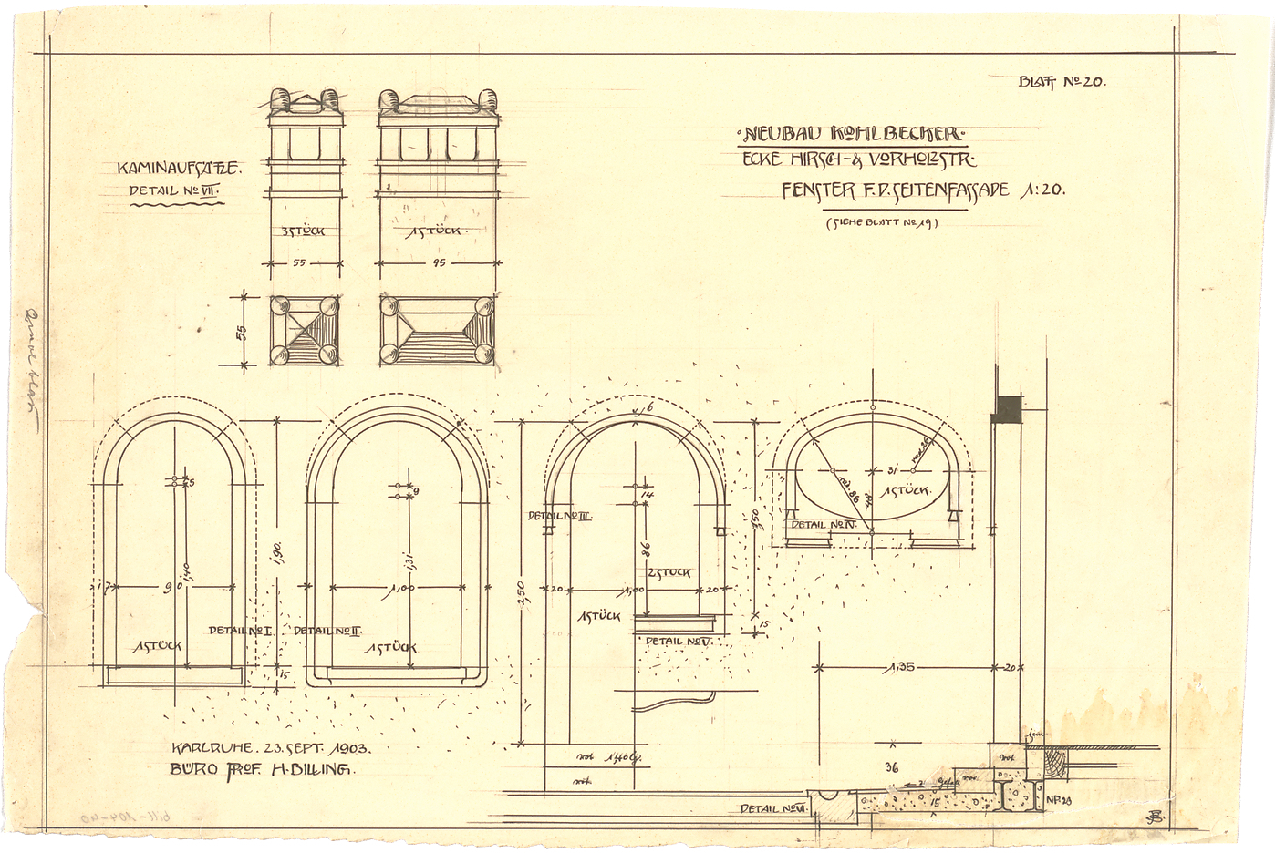 - Seitenfassade, Fenster (Ansicht; Schnitt); Kaminaufsätze (Grundriss; Ansichten)