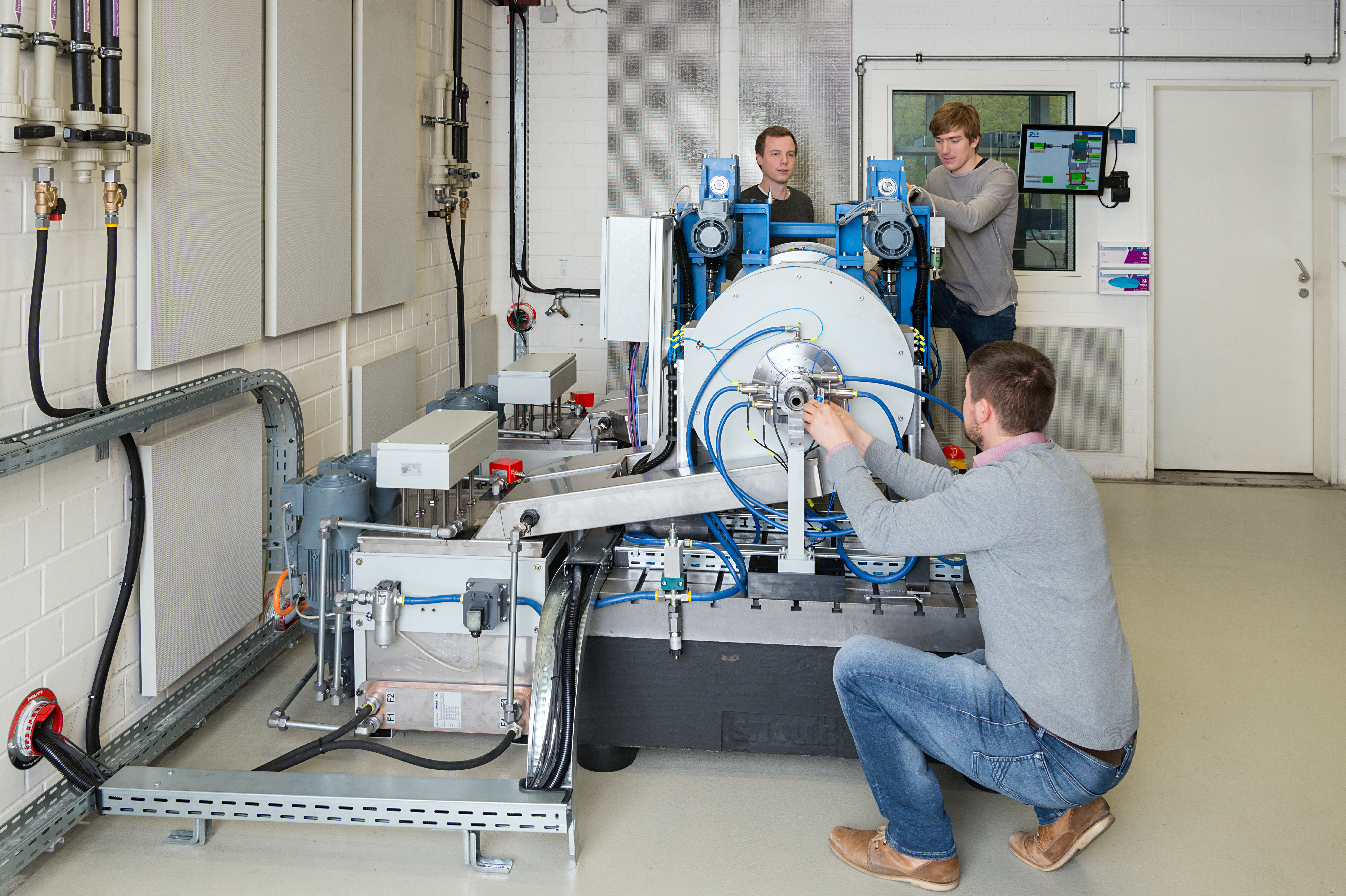 Joshua Götz; Felix Siglmüller und Uwe Weinberger bei Einstellarbeiten am Planetengetriebeprüfstand. Copyright: Uli Benz / TU München ; Verwendung: frei für Berichterstattung über die TU München unter Nennung des Copyrights.