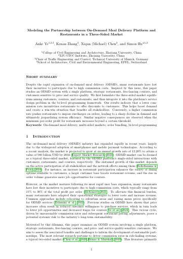 Modeling the Partnership between On-Demand Meal Delivery Platform and Restaurants in a Three-Sided Market