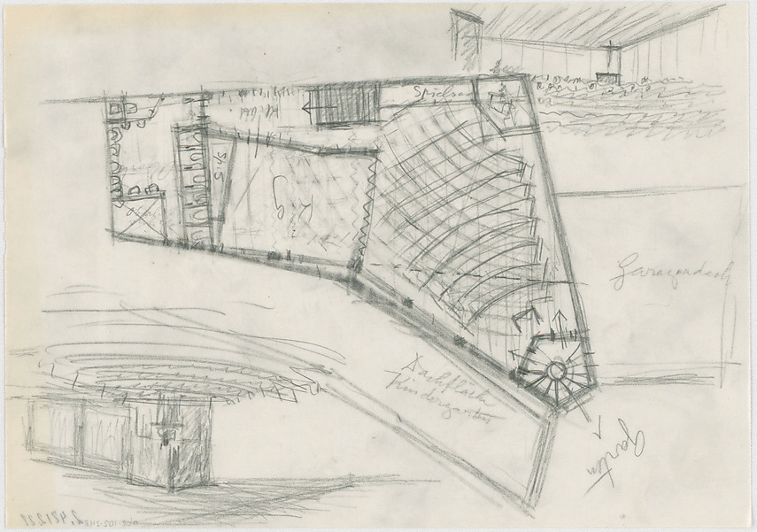 - Innenraumperspektiven; Saal; Kindergarten; Waschraum; Dachflächen Kindergarten und Garage (Grundriss)
