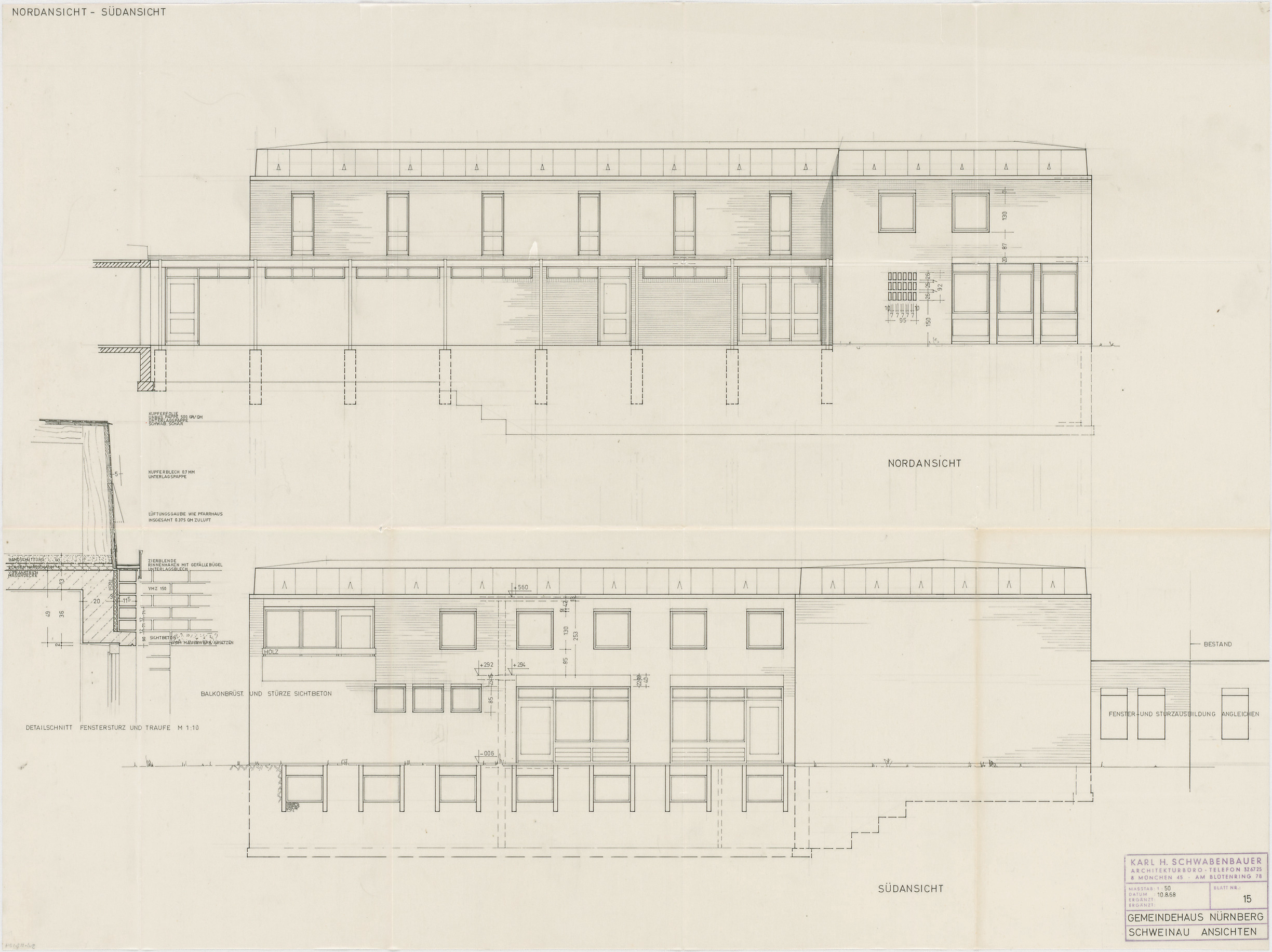 - Gemeindehaus (Südansicht; Nordansicht), Fenstersturz und Traufe (Detailschnitt)