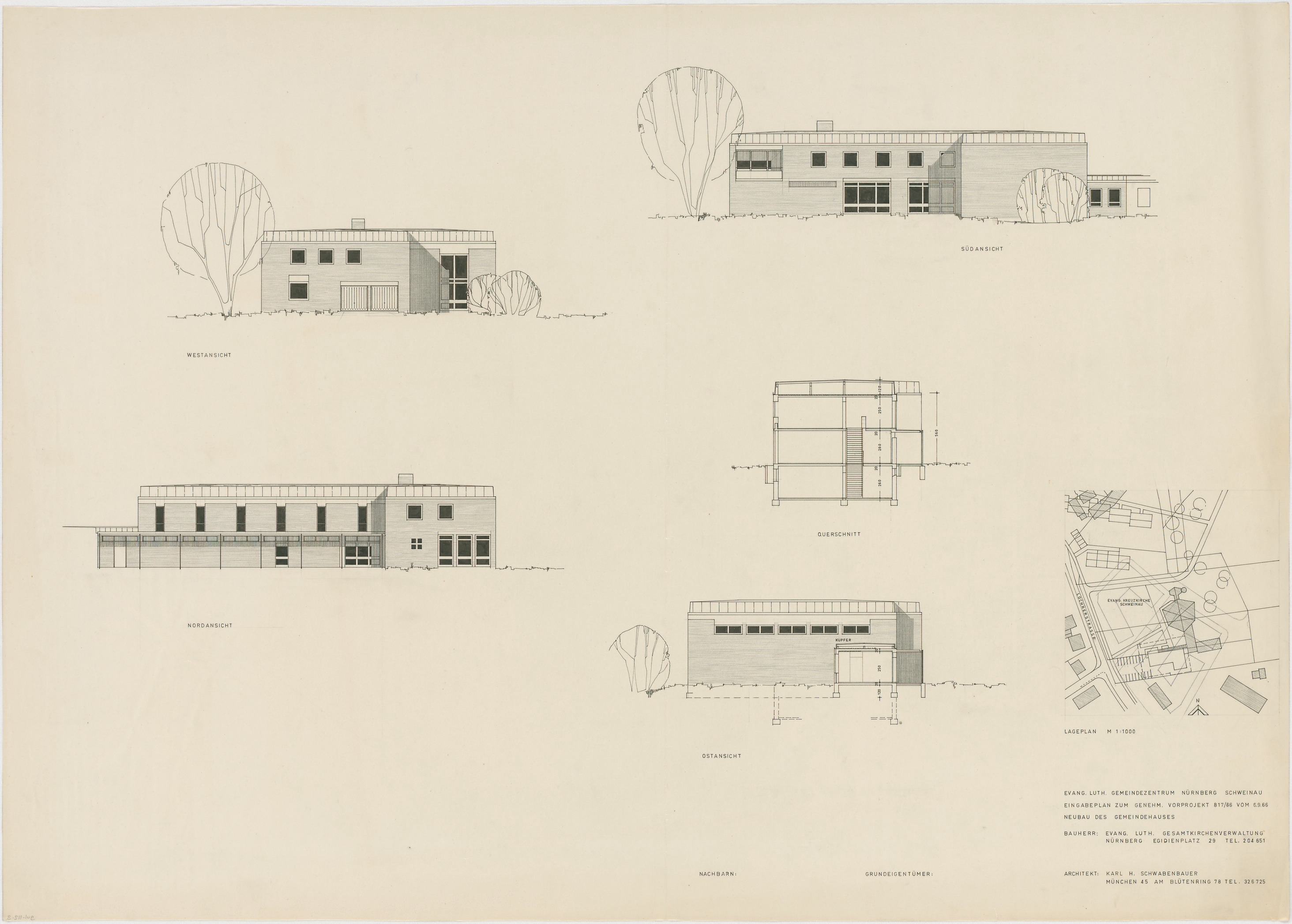 - Eingabeplan, Gemeindehaus (Ostansicht; Südansicht; Westansicht; Nordansicht; Querschnitt; Lageplan)