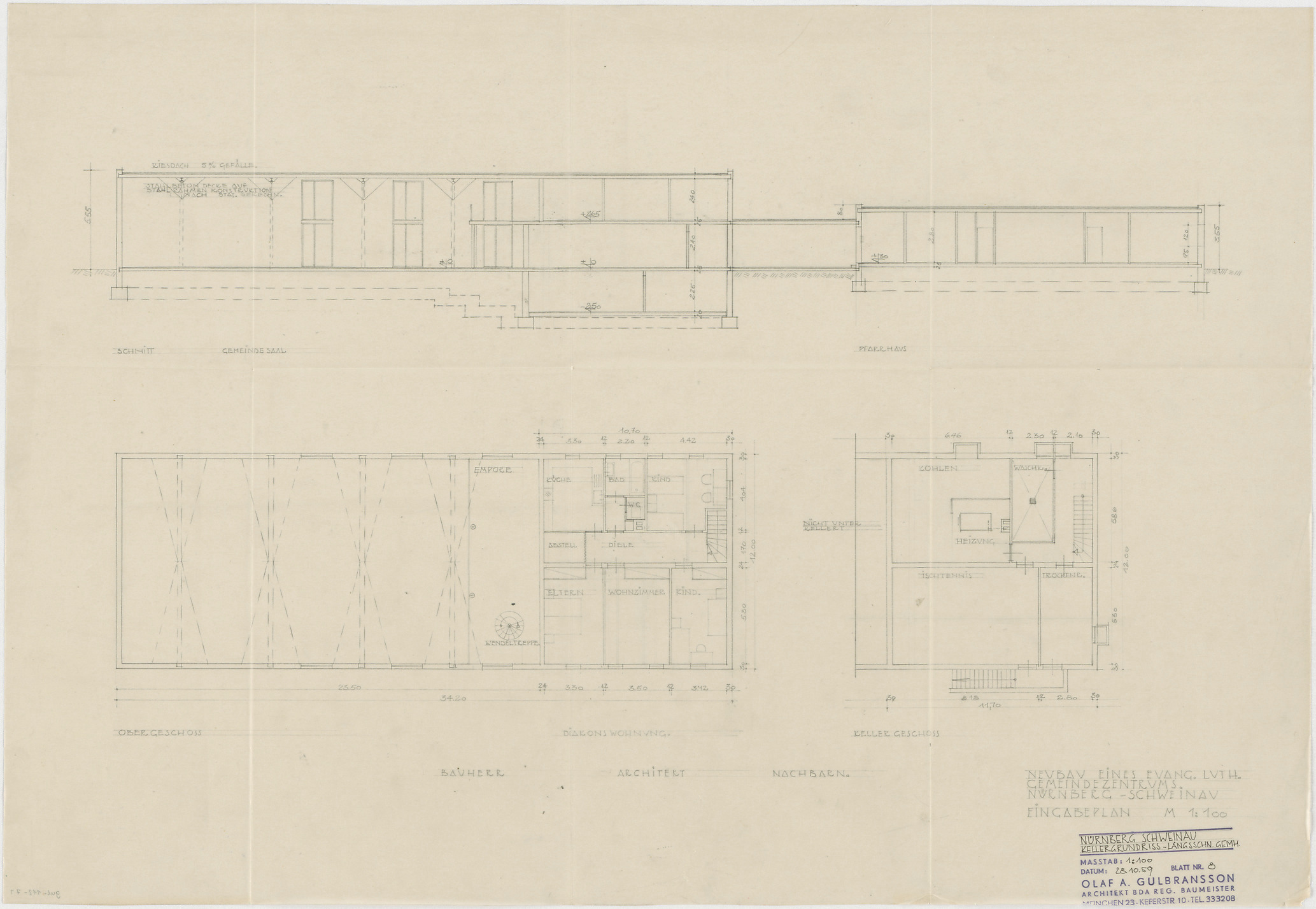 - Längsschnitt Gemeindehaus; Kellergrundriss