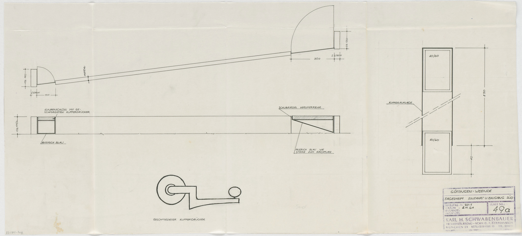 - Tagesheim, Einfahrt und Eingang Süd (Grundriss; Ansicht); geschmiedeter Kupferdrücker (Ansicht)
