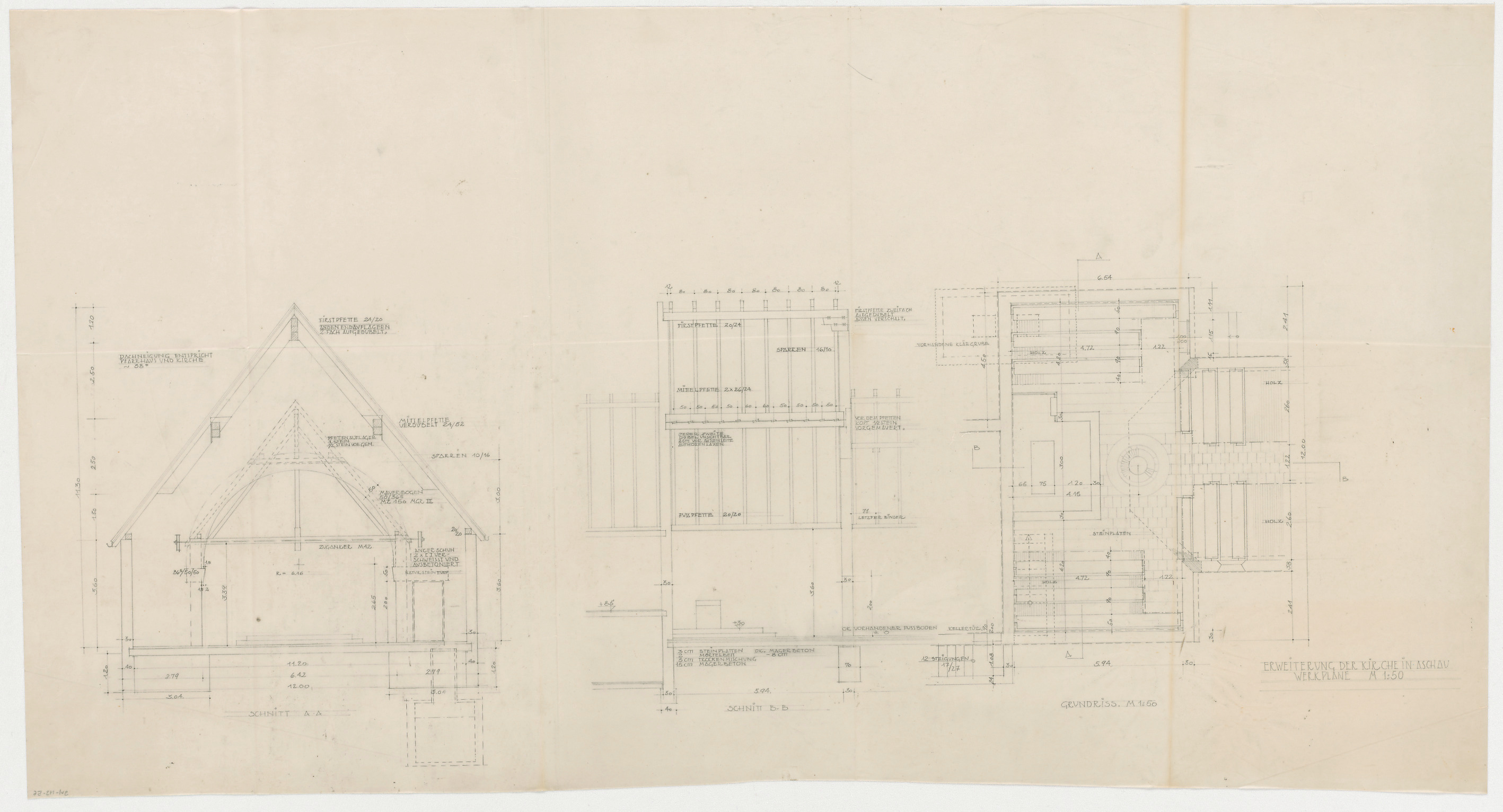 - Werkpläne, Erweiterung der Kirche, Altarraum (Grundriss; Längsschnitt); Dachfenster (Schnitt)