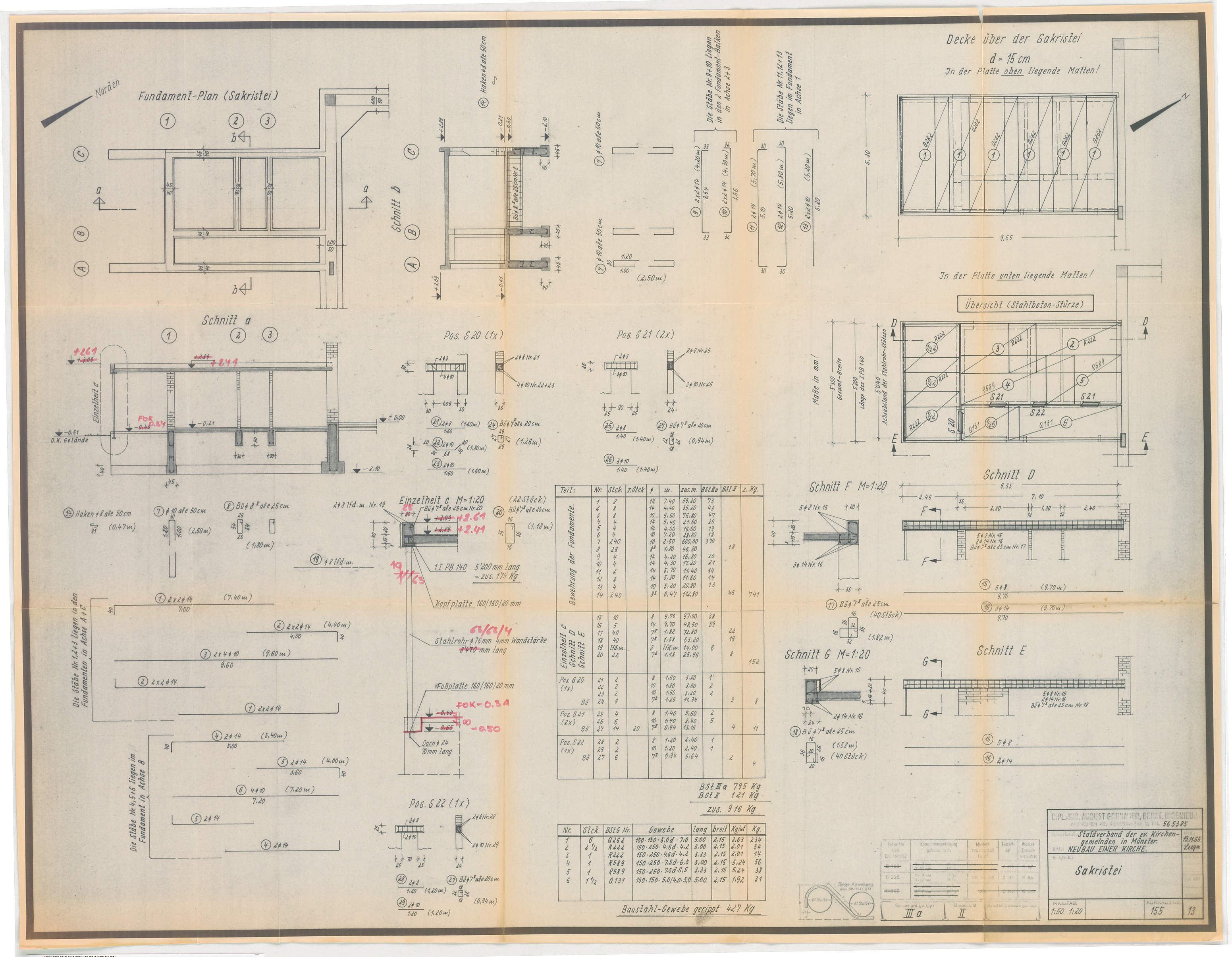 - Bauteil Sakristei, Fundamentplan, Decke über der Sakristei (Grundriss; Aufsicht; Schnitte)