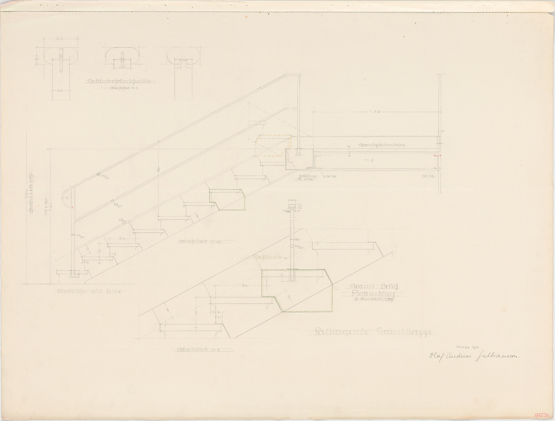 - Freitragende Granittreppe (Ansicht mit Schnitt; Detailansicht mit Schnitt), Geländerholm (Schnitte)