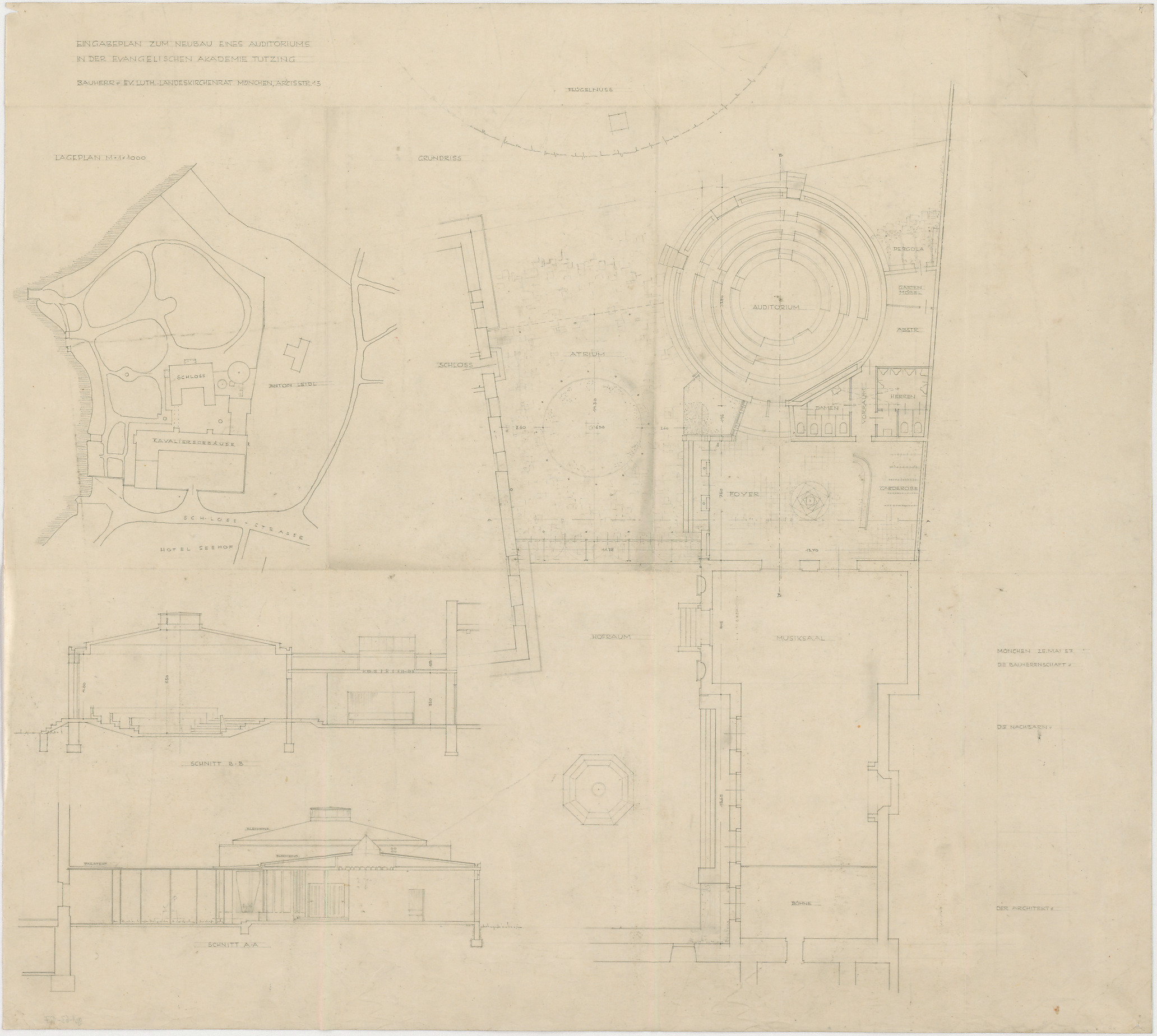 - Auditorium (Rotunde): Eingabeplan (Lageplan; Grundriss; Schnitt A-A; Schnitt B-B)