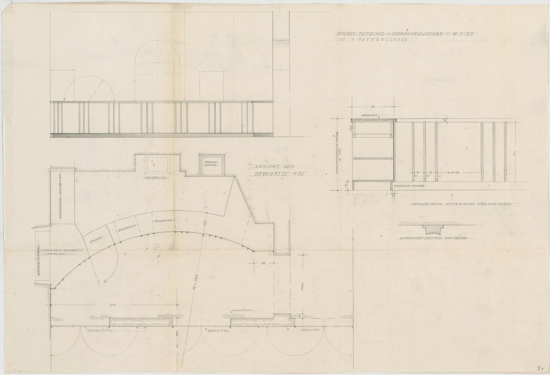 - Schloss Tutzing, Getränkeausgabe 1. OG (Grundriss; Ansicht; Schnitt)