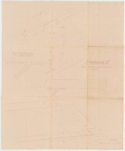 - Detailpunkt "B"; Biegeschablone für Anschlussblech (Schnitte); Fachwerkträgeranschluss an Gratträger (Schnitt; Perspektive)