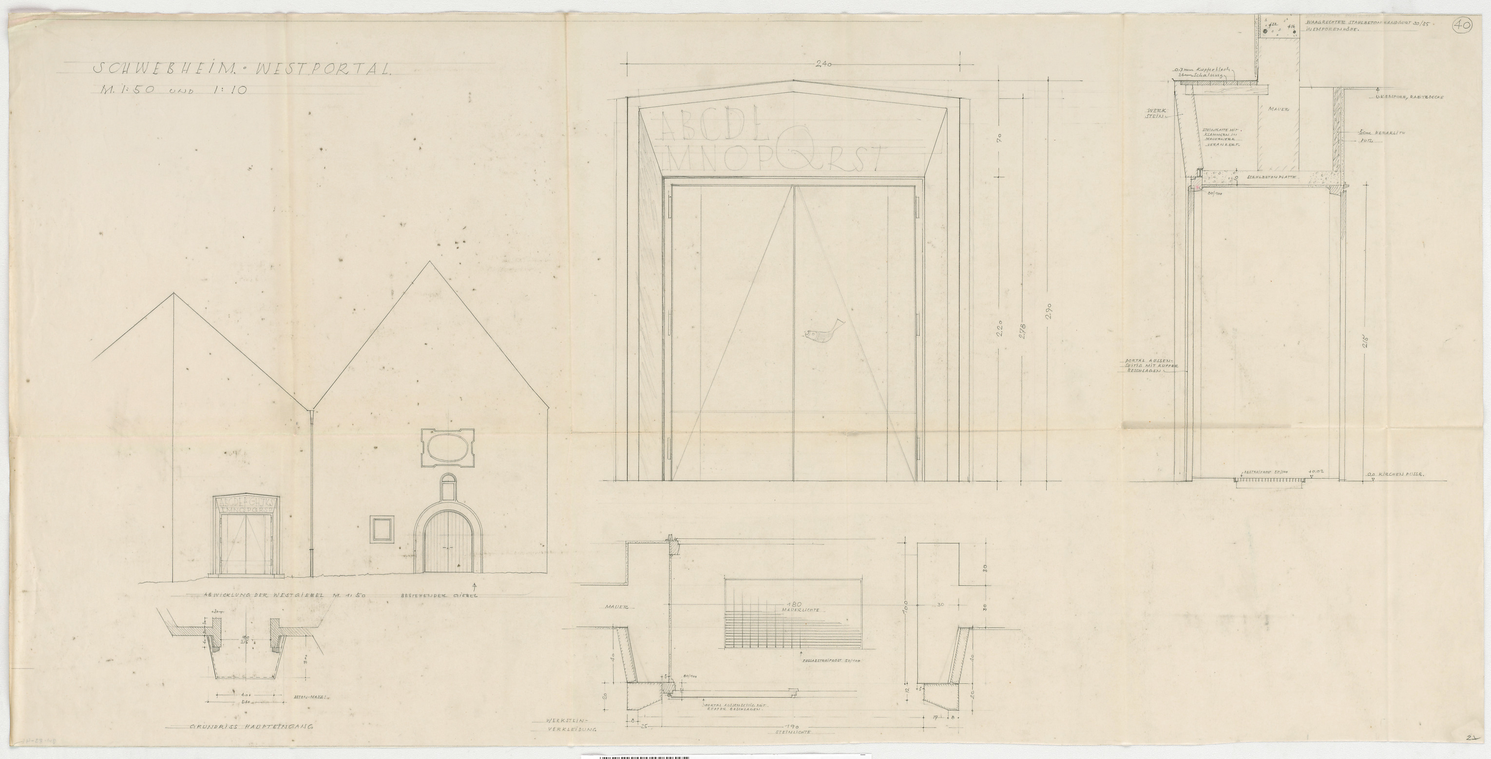 - Westportal (Grundriss; Ansicht; Schnitt); Abwicklung der Westgiebel; Haupteingang (Grundriss)