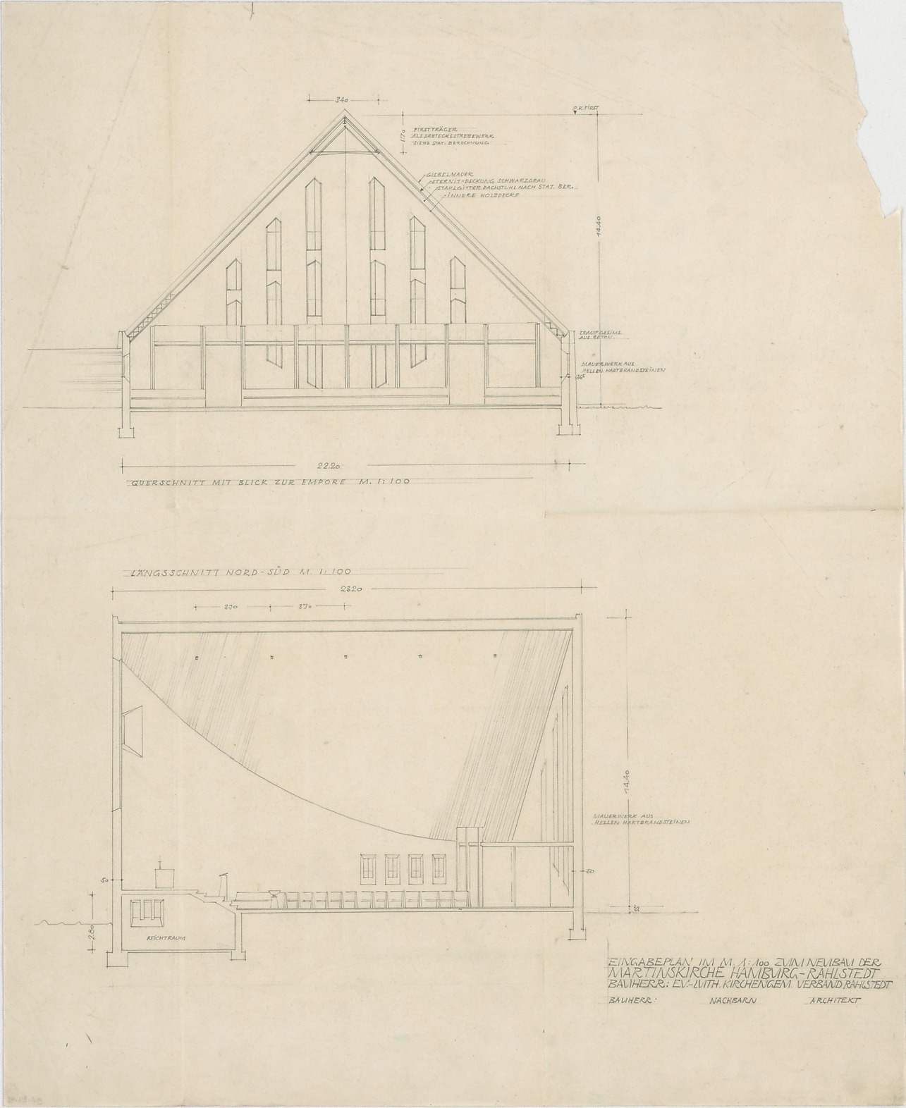 Eingabeplan, Querschnitt mit Blick zur Empore; Längsschnitt Nord - Süd