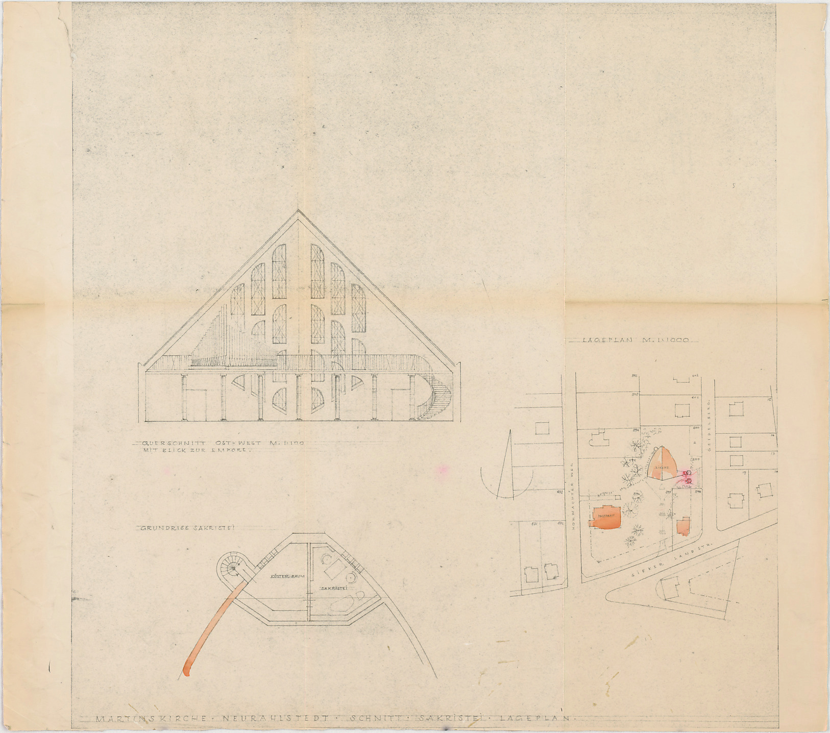 Querschnitt Ost - West mit Blick zur Empore; Sakristei (Grundriss); Lageplan