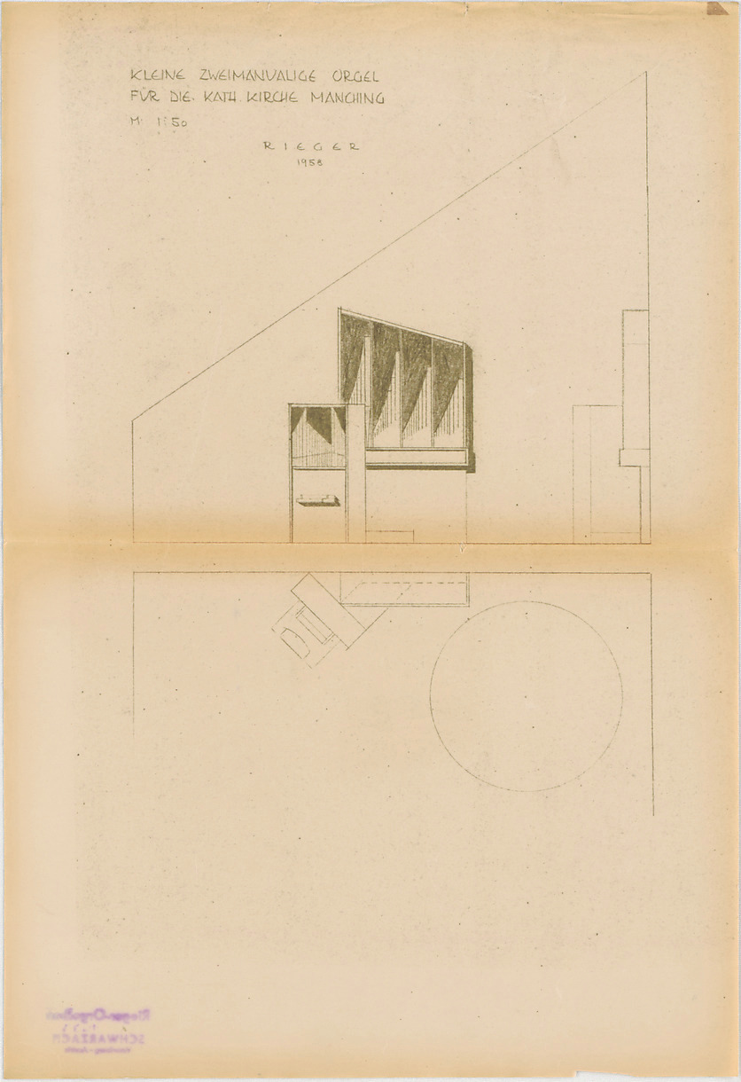 - Kleine zweimanualige Orgel (Grundriss; Seitenansicht; Perspektive)
