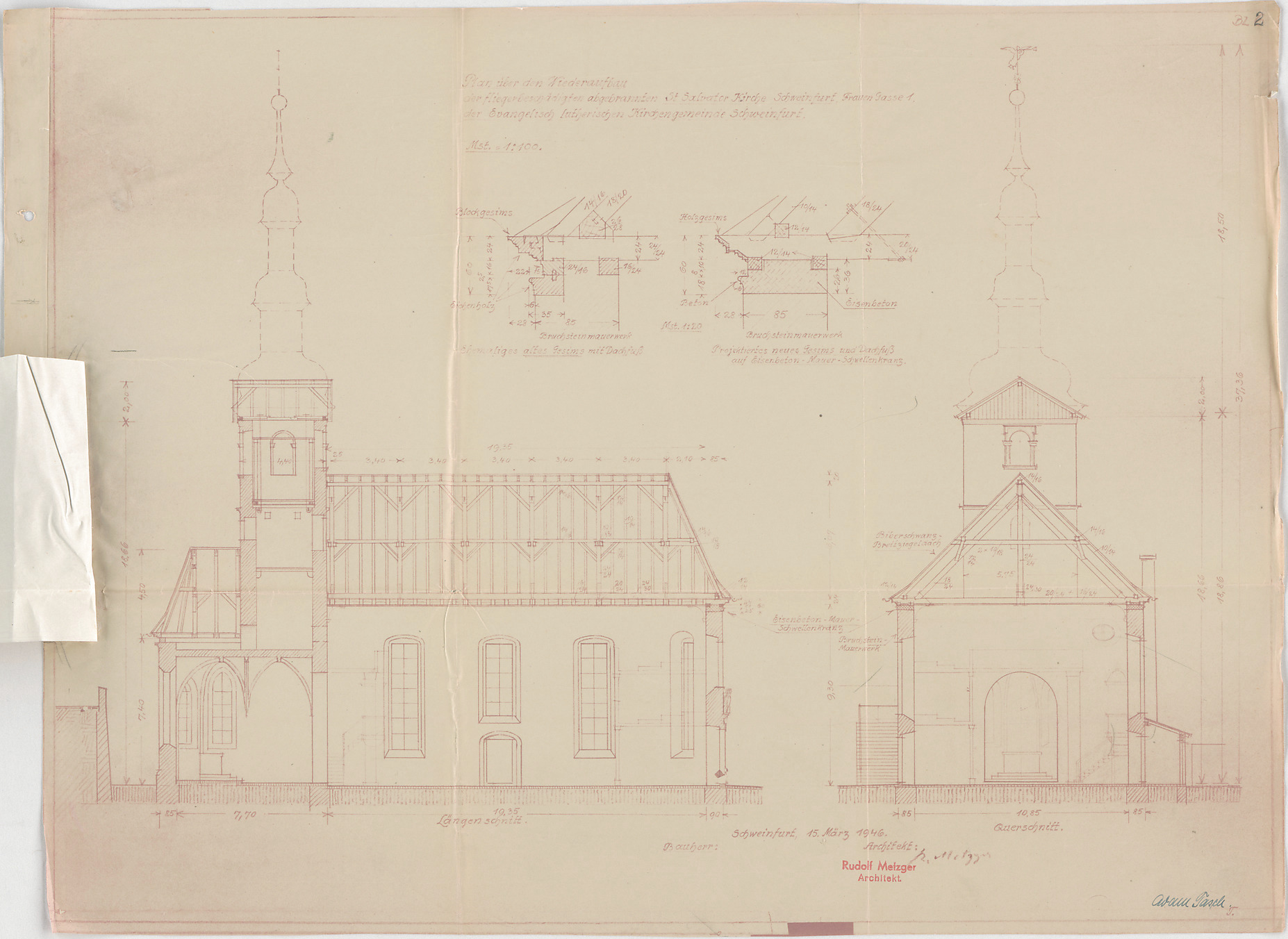 - Wiederaufbau der beschädigten Kirche, Querschnitt; Längsschnitt; Gesims mit Dachfuß (Schnitte)