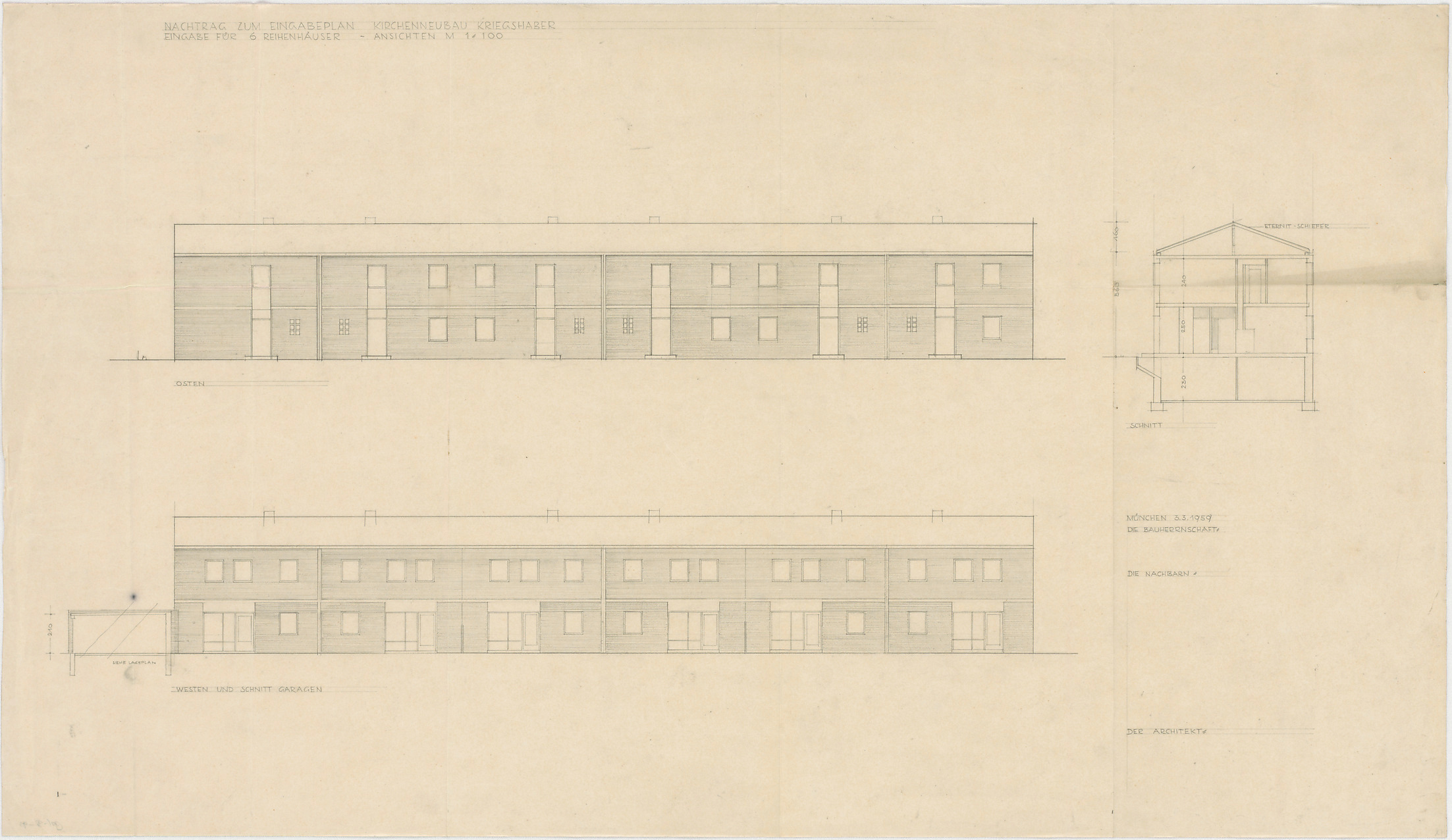 Nachtrag zum Eingabeplan, Baueingabe für 6 Reihenhäuser von Ost und West (Ansichten); Garagen (Schnitt)