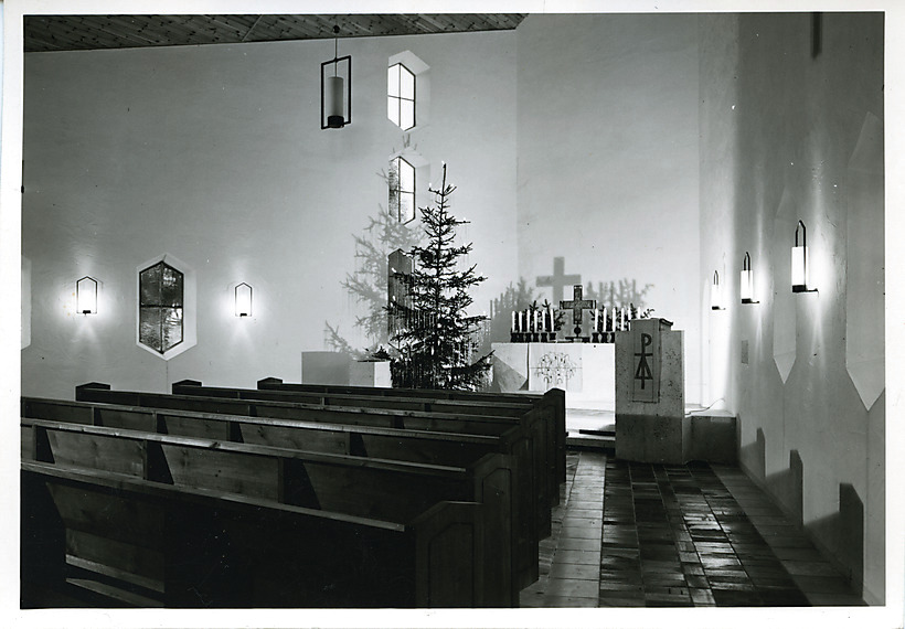 - Blick durch den Innenraum zum Altar (Innenraumperspektive)