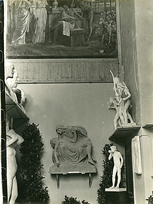 Beschriftung auf der Rückseite: links Fulria (abgeschnitten); Gemälde oben: Gemeinschaftsarbeit von den Töchtern: Irene Sattler, Elisabeth und Irene Hildebrand; von den Modellen für die Hubertusbrunnenfiguren existiert nur noch das vodere für die junge Jägerin