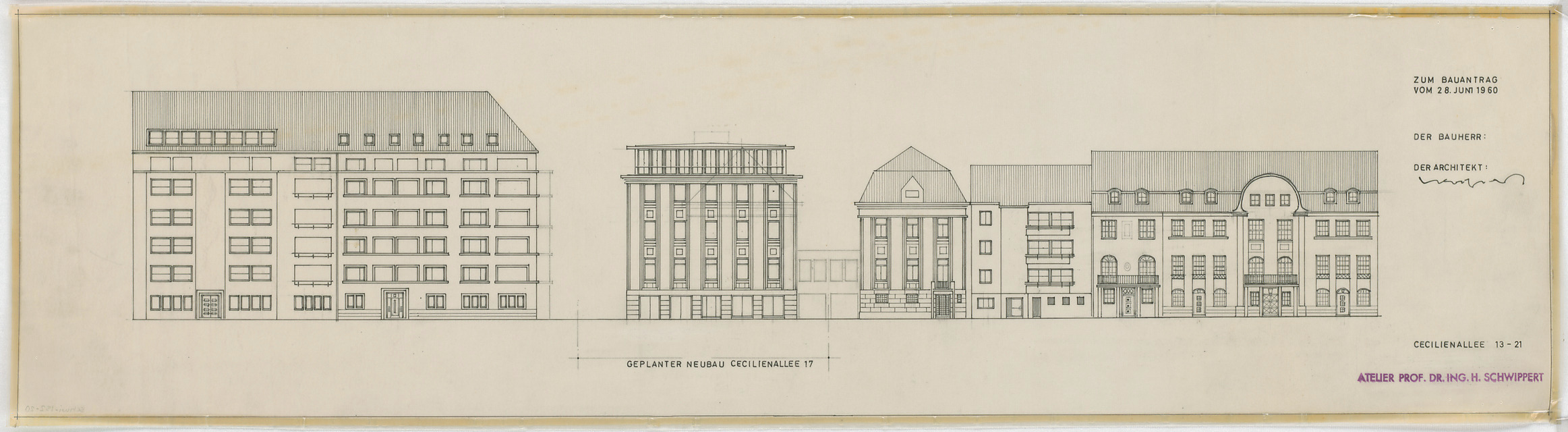 - Straßenansicht mit geplantem Neubau, Fassadenabwicklung