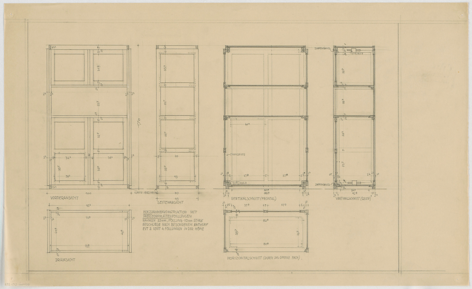 - Schrank, Holzrahmenkonstruktion mit Presstorfplattenfüllungen (Ansichten; Schnitte; Aufsicht)