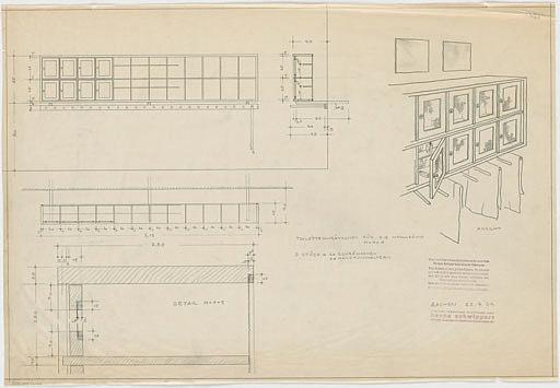 - Kleiner Schrank mit Fächern; Handtuchhalter für Waschräume (Ansicht; Schnitte; Perspektive, Detail)