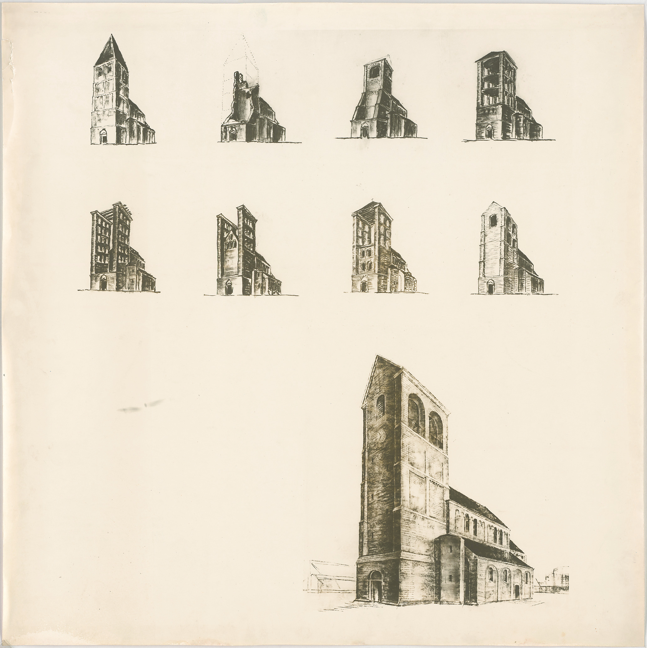 - Kirche mit altem, zerstörtem und neuem Turm; Turmentwürfe (Perspektiven)