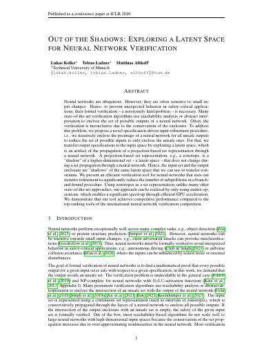 Koller, Lukas;Ladner, Tobias;Althoff, MatthiasOut of the Shadows: Exploring a Latent Space for Neural Network VerificationProceedings of the 14th International Conference on Learning Representations (ICLR)2026