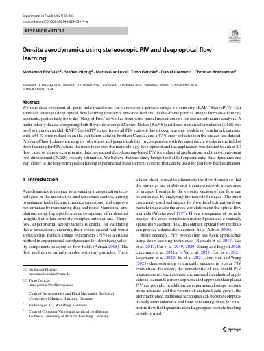 On-site aerodynamics using stereoscopic PIV and deep optical flow learning