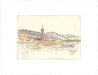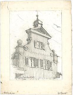 Gustav Gsaenger (1900-1987) wurde in München geboren und besuchte das humanistische Maximiliansgymnasium. Nach dem Abitur studierte er von 1920 bis 1924 an der damaligen Technischen Hochschule München Architektur bei German Bestelmeyer (1874-1942). Anschließend arbeitete er als Assistent und engster Mitarbeiter an dessen Lehrstuhl. Von Bestelmeyer erlernte Gsaenger auch die Technik der Kohlezeichnung, die er bald meisterhaft beherrschte und deren expressive Wirkung er für die Betonung baulicher Strukturen einsetzte wie bei den Wettbewerbszeichnungen für ein „Theater für 4000 Personen“ in Charkow (1930).