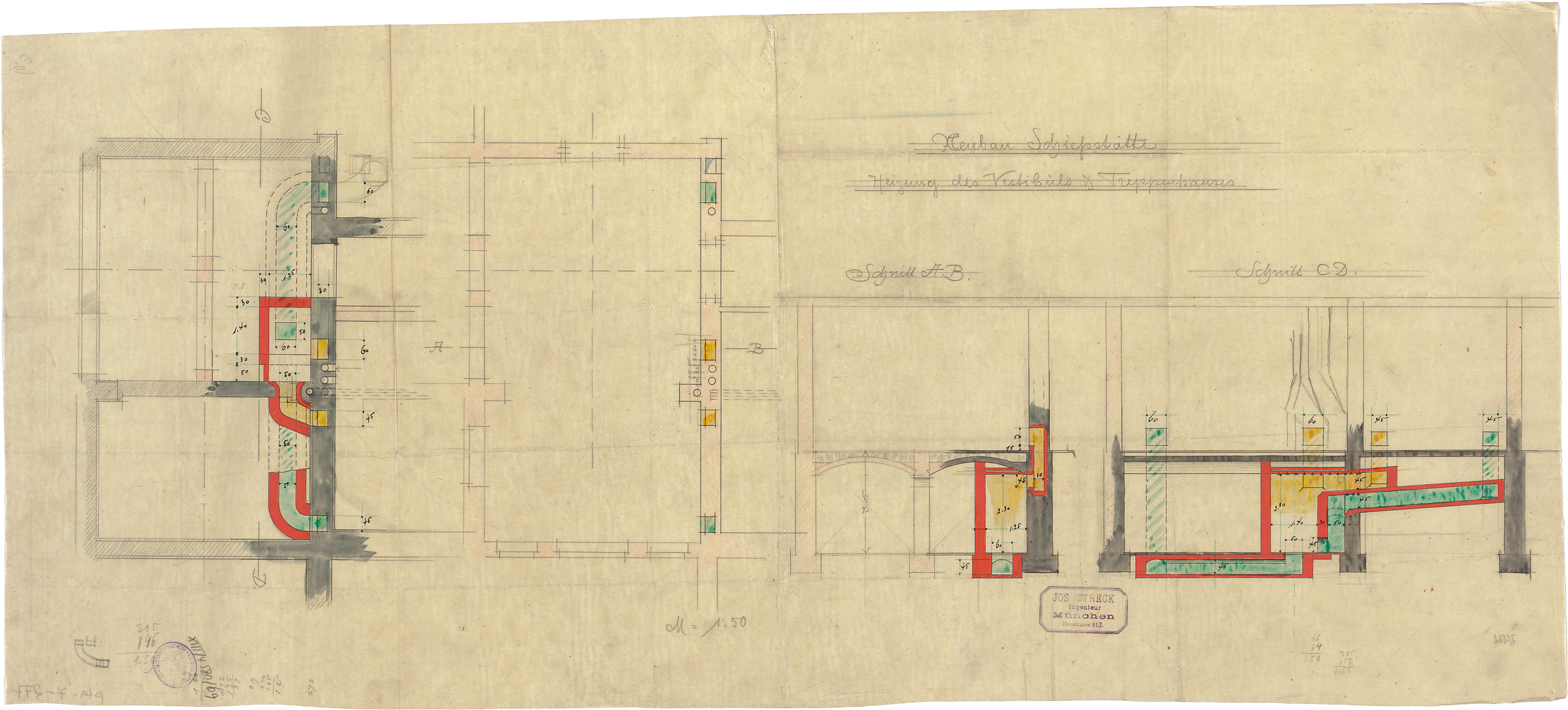 - "Schnitt A.B.", "Schnitt C.D."; unten links: Inv. Nr. XIII 4580 (69); Stempel mit Aufschrift: Jos. Streck Ingenieur München...