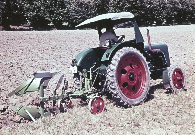 Radtraktor RS 14 mit Einschar-Drehpflug im Einsatz