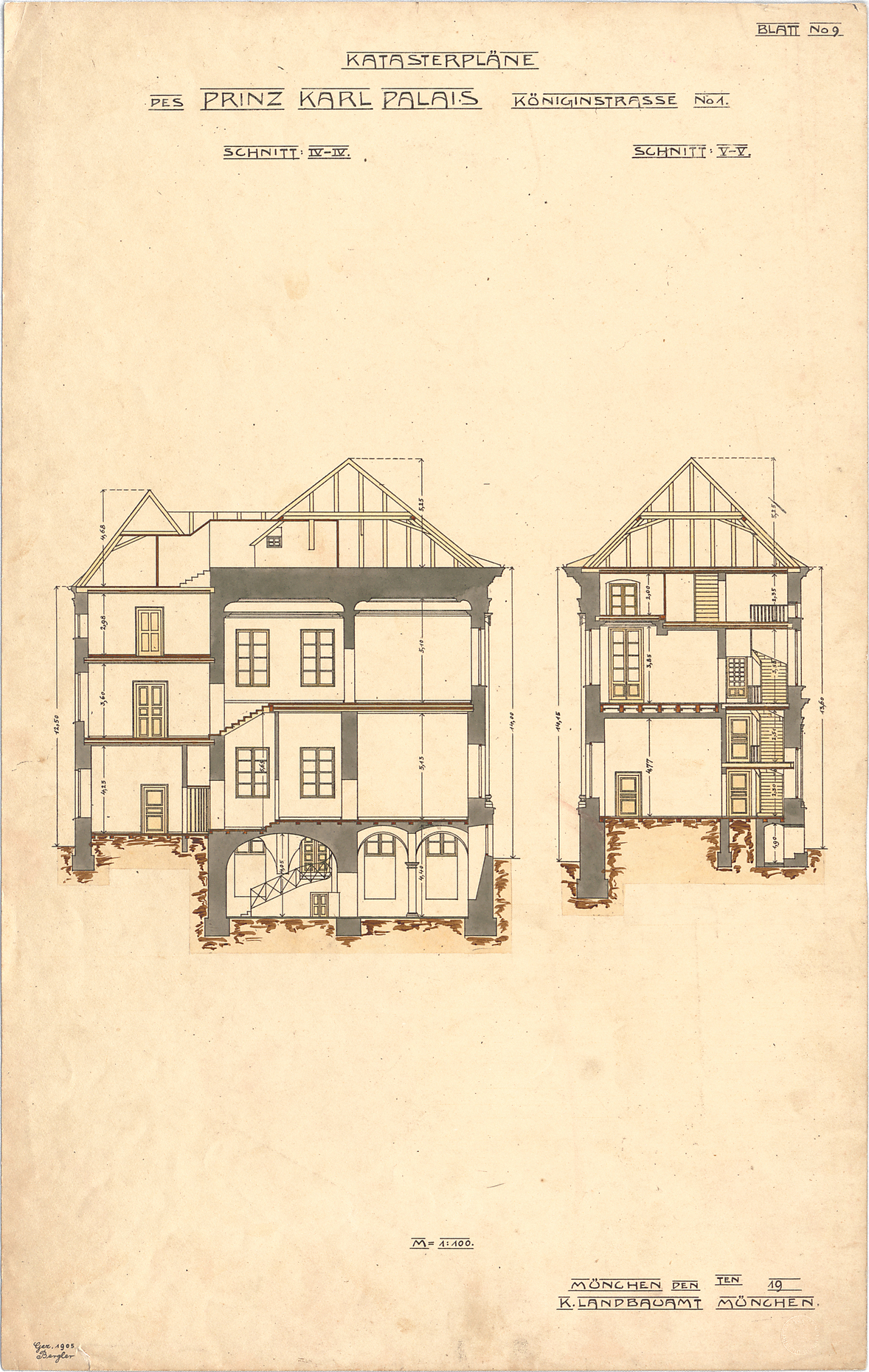 - "Schnitt IV-IV" "Schnitt V-V"; oben rechts: Blatt No. 9; Original siehe land-3-21